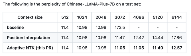 数据显示,相比与位置插值法,NTK 动态插值法不会显著增加大模型的困惑度。