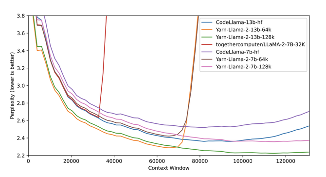数据显示,在 128K 的 Proof-Pile 数据集上评测,Yarn-Llama-2-7b-128K/64K 模型的困惑度仍然保持良好下降。