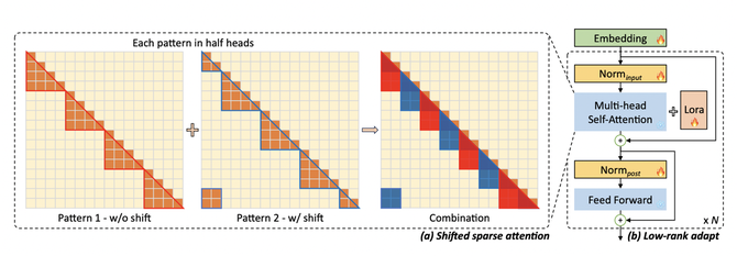 LongLoRA 是香港中文大学联合 MIT 提出的一种模型微调方法,其论文 LONGLORA: EFFICIENT FINE-TUNING OF LONG-CONTEXT LARGE LANGUAGE MODELS。下图是论文中描述的方法: