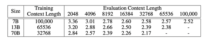 实验结果如下,用了一个 8 个 A100 的机器微调,将 Llama2 7B/13B/70B 模型分别扩展到 100K,64K, 32K 长度,而大模型的困惑度并没有明显变化。