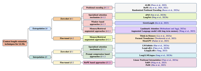 最近 Technology Innovation Institute(TII)发表了一篇论文综述The What, Why, and How of Context Length Extension Techniques in Large Language Models – A Detailed Survey,调研了业界的扩展大模型的技术,下图源自论文。