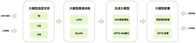 KubeAI 平台为用户提供了非常便捷的大模型训练和部署功能。用户无需关注底层基础设施,就可以通过简单的步骤上传数据、配置参数、选择模型,从而获得针对自己业务自定义的大模型。