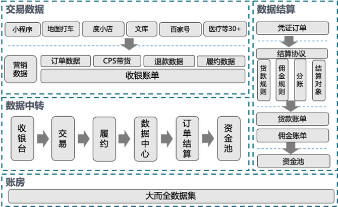 数据账房:交易中台数据的统一出口,涵盖订单、结算账单和资金池流水等,商家通过该系统可直接查询收入/其他款项/支出等流水信息,提供按天/月/年的财务对账。