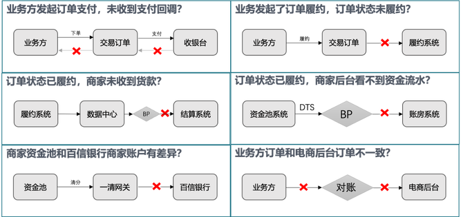 在这样的交易背景下,我们要保障交易数据的准确性和时效性,同时还需要保障履约、结算、资金账单以及商家付款的时效性和数据一致性,这就给我们的对账系统带来了巨大的挑战。简单介绍下交易系统运行过程中出现过的问题,如下图: