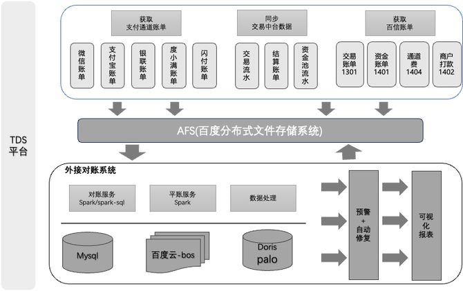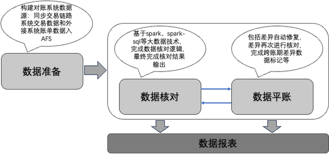1.对账系统依赖的数据量较大,数据量达到了TB级别,采用spark、spark-sql、afs等大数据技术实现系统的对账能力。