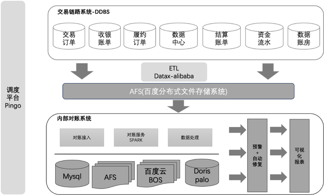 2.“T+1”离线对账系统:使用大数据计算完成对账,依托ETL工具进行数据同步,SPARK、SPAKR-SQL、AFS等大数据技术完成系统间数据的对账,及时发现数据差异、差异数据预警以及差异数据的自动修复能力。