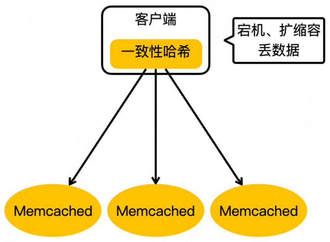 上图就是美团第一代的分布式 KV 存储的架构,可能很多公司都经历过这个阶段。在客户端内做一致性哈希,然后在后端部署上很多 Memcached 实例,这样就实现了最基本的 KV 存储分布式设计。但这样的设计存在很明显的问题:比如在宕机摘除节点会时丢失数据;此外,在缓存空间不够需要扩容时,一致性哈希也会丢失一些数据,这样会给业务的开发带来很大的困扰。