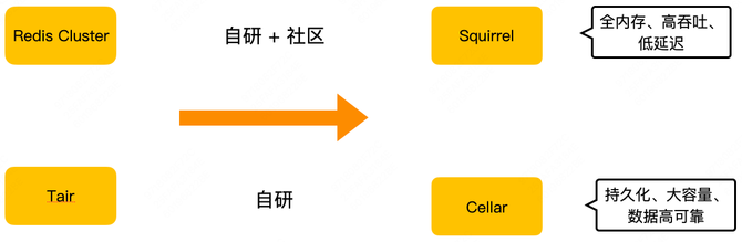 Redis 社区一直都很活跃,所以,Squirrel 的迭代是自研和社区并重,自研功能设计上也会尽量与社区架构兼容。Tair 开源版本已经多年没有更新,所以,Cellar 的迭代完全靠自研。后续内容上大家也能看到,因为这方面的不同,Cellar 和 Squirrel 在解决同样问题时可能会选取不同的方案。