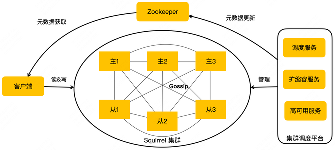 上图是美团的 Squirrel 架构。中间部分跟 Redis 社区集群是一致的。它有主从的结构,Redis 实例之间通过 Gossip 协议去通信。我们在右边添加了一个集群调度平台,包含调度服务、扩缩容服务和高可用服务等,它会去管理整个集群,把管理结果作为元数据更新到 ZooKeeper。我们的客户端会订阅 ZooKeeper 上的元数据变更,实时获取到集群的拓扑状态,直接对 Redis 集群节点进行读写操作。