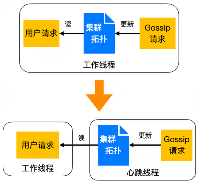 针对上述提到的 Gossip 消息处理影响业务请求的问题,我们把 Gossip 消息处理功能剥离到一个单独的心跳线程里,并且由心跳线程来更新集群拓扑的元数据。对于处理用户请求的工作线程,仅需要对元数据进行读操作,可以做到无锁读。这样的话,Gossip 请求处理就对业务请求完全没有影响了。