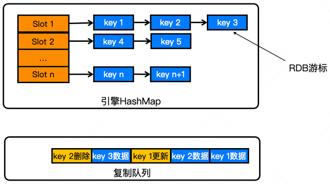 如果在迭代哈希表的过程中,里面的 KV 有变更的话,在这个游标之前的 KV 变更,也会把它放到复制队列里边,确保已经复制的 KV 能够持续获得后续的变更。如图所示,RDB 游标在 key 3,它会把之前已经迭代过的 key 1 更新、key 2 删除操作也插入到复制队列里边。在游标之后的 key,因为还没有做数据复制,所以等后续迭代到这个 key 时,把其最新值 dump 到复制队列就好。通过这样的方式,就实现了一个不需要 fork 就能获得一个一致性数据快照 RDB 的过程。