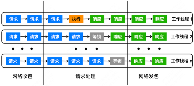 如上图所示,在工作多线程方案下,每个线程都会去处理请求,并且每个线程会完成从收包到请求处理,然后到发包的整个过程,是一个 Run-to-Completion 线程模型。相比 IO 多线程,它会减少很多线程切换,节省很多的 CPU 资源。同时对于请求处理的过程,我们也通过细致的梳理,尽量缩小了临界区的范围,以保证大部分的请求处理过程是在临界区之外的,来提升处理并发度。