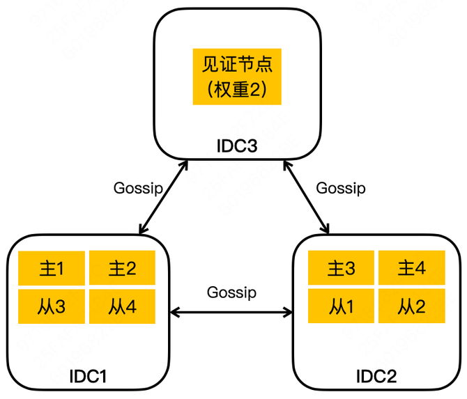 见证者节点还可以设置权重,这样只需要一个或几个高权重见证者节点,就能满足一个大规模集群的容灾部署需求了。由于见证者节点不存储数据,且节点数很少,虽然集群还是三机房部署,但实际几乎只需要两机房的资源就能满足机房容灾部署需求了,这样就大幅降低了集群维持容灾部署的难度,从而节省大量的机器成本。