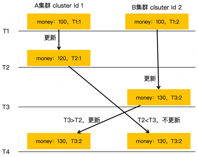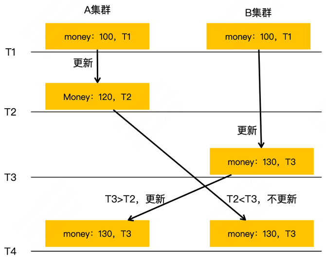 如上图所示,在 T1 时刻 Key money 的值在 A、B 两个集群都是 100。T2 时刻,money 的值在 A 集群更新成了 120。但是在 A 集群的新值还没复制到 B 集群的时候,B 集群在 T3 时刻把 money 的值更新成了 130。这时候 A、B 集群会互相向对方复制各自写入的新值,A 集群收到 B 集群的值 130 后,会发现 B 集群 money 的更新时间大于自己(T3 > T2),它就会更新自己的 money 值为 130;B 集群也会收到 A 集群复制过来的 money 值 120,但它会发现这个值的更新时间小于自己本地值的更新时间(T2 < T3),就会忽略这个复制请求。通过这样一个基于更新时间的 last write win 策略,就可以达到最终一致性。