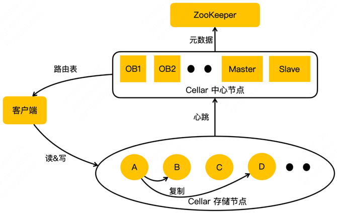 第一个是 OB,第二个是 ZooKeeper。我们的 OB 跟 ZooKeeper 的 Observer 是类似的作用,提供 Cellar 中心节点元数据的查询服务。它实时的与中心节点的 Master 同步最新的路由表,客户端的路由表都是从 OB 去拿。这样做的好处主要有两点:第一,把大量的业务客户端跟集群的大脑 Master 做了隔离,防止路由表请求影响集群的管理;第二,因为 OB 只提供路由表查询服务,不参与集群的管理,所以它可以水平扩展,极大地提升了路由表的查询能力。