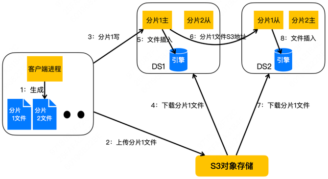 然后 DS1 会把分片 1 数据文件的对象存储地址复制发送到分片 1 的从所在的存储节点 DS2 。因为存储节点的复制只是传输数据文件的地址,所以复制速度是特别快的,也节省了很多传输的带宽。DS2 收到了分片 1 的地址后同样会从对象存储下载数据文件,并插入到引擎里面。
