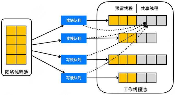 所以,为了隔离在离线请求、快慢请求的处理,让服务资源优先保证核心流量的处理,我们后来把线程模型改造成如上图所示的 4 个队列 + 4 个线程池的结构,将请求分成 4 类(读快、读慢、写快、写慢)分别放到不同的队列和线程池去处理,进而来提升服务核心流量的可用性。