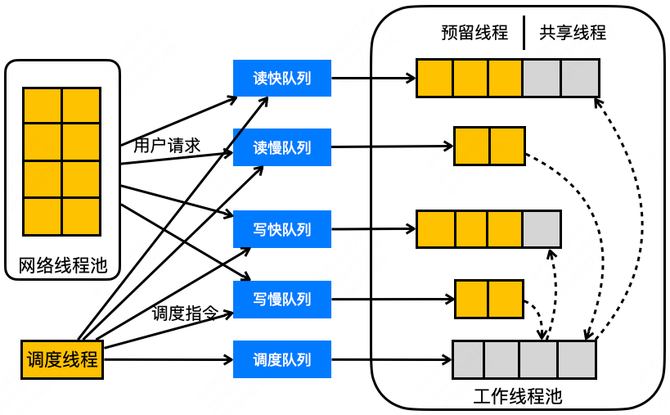 当调度线程评估后决定做线程资源调配时,它就会发送调度指令到相应队列中,当线程池里的线程获取并执行了这个指令后,就实现了线程资源的调配。比如,它想给读快线程池增加线程,就会给空闲线程池的队列发送一个调度指令,空闲线程池的线程取到这个指令后,就会将自己加入到读快队列的线程池里面,去处理读快队列的请求。