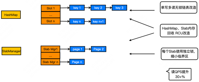 对于 HashMap,我们做了单写多读的无锁链表改造。同时,通过引入 RCU 机制实现了异步的内存回收,解决了读请求与写请求内存释放操作的冲突,实现了读请求处理全程的无锁化。写请求虽仍需要加锁,但我们对写做了锁粒度的优化,可以大幅提升并发度。比如我们把 SlabManager 的访问由一把大锁改成每个内存尺寸的管理链表单独一把锁,这样在分配和释放不同尺寸内存页的时候就可以实现并发。同时 RCU 机制下的内存异步回收,也解决了写线程回收内存时可能被阻塞的问题,进一步提升了写性能。