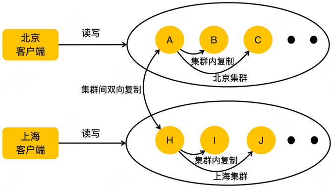 Cellar 也可以通过配置两个方向的跨集群数据同步链路,实现完全的本地域读写。Cellar 由于采用了存储节点内建的方案,它的集群间复制通过使用定制的复制包来甄别客户写入和复制写入,并只为客户写入生成复制 log 来避免循环复制,相对Squirrel 会简单一点。但同样的,这种架构也会遇到极端情况下,双向同步导致的数据冲突问题。
