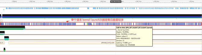 广告精排模型推理主要表现是单个请求耗时较短(毫秒级),同时每个请求中gpu kernel调用次数较多,每次gpu kernel的调度都会伴随相应的kernel launch,琐碎繁多的kernel launch会严重制约GPU模型的吞吐能力,同时会导致模型系统耗时较高,通过Nsight性能分析性能数据如下。