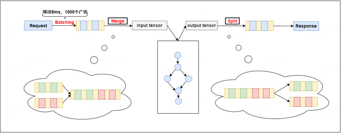 kernel launch 本质上是从host端核函数调用到GPU开始计算之间的这段时间,主要包括准备计算需要数据的传输和执行需要warp线程束的获取,无论是数据的传输还是选取执行所需要的warp线程束,多个请求之间是可以实现共享的,因此我们核心解决问题的思路是将多个模型推理请求合并成一个请求,完成模型推理后在对结果再进行合理的分割,减少请求级别 kernel launch 的数量,极大的提升kernel launch的效率,从而进一步提升GPU模型的吞吐能力,架构方案如 图3, 例如 1个模型请求经过tensorflow推理需要进行 1000 次 kernel launch,3个请求需要3000次kernel launch,如果将3个请求合并成1个请求,那么kernel launch数量会从3000 降至1000。