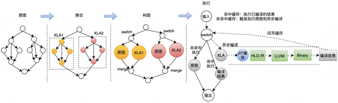 b)推理过程动态选择,命中分桶情况则选择XLA Runtime执行,未命中则选择原图执行,同时服务后台触发异步XLA编译,供下次请求使用。