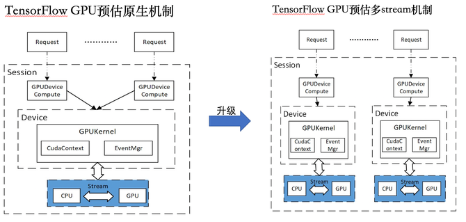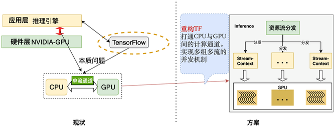 Tensorflow深度学习框架虽然提供了GPU计算能力,但其CPU到GPU的交互通道仅为单通道模式。在线并发推理的场景下,存在算子调度互斥、算子计算阻塞排队等问题。针对上述痛点我们设计了GPU多通道模式-多流计算架构,真正实现了GPU的并发计算能力。