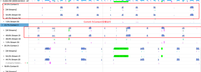 多GPU通道(多CudaStream + 多CudaContext)解决了KernelLaunch调度问题,算子调度可以并行执行,减少了执行的GAP。但在GPU硬件层面,CudaContext采用分时复用原则,即此某一时刻只有一个CudaContext被调度执行,没有完全达到算子计算间的并行。