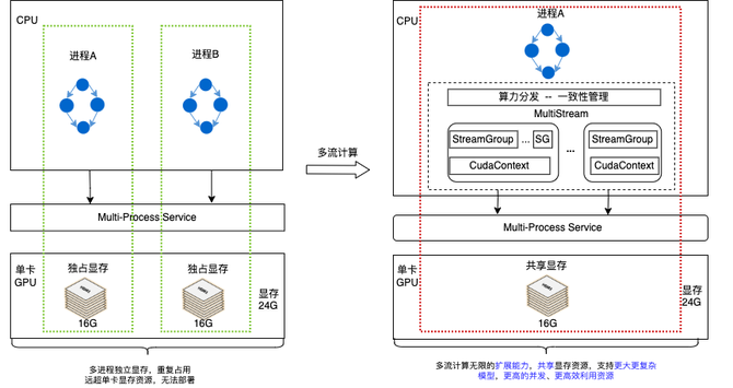 因此,我们升级了多流计算架构,将MPS与自研的多CudaStream + 多CudaContext的多流计算架构相结合,解决了显存瓶颈的问题,最终通过单进程模型部署实现真正的并行计算。