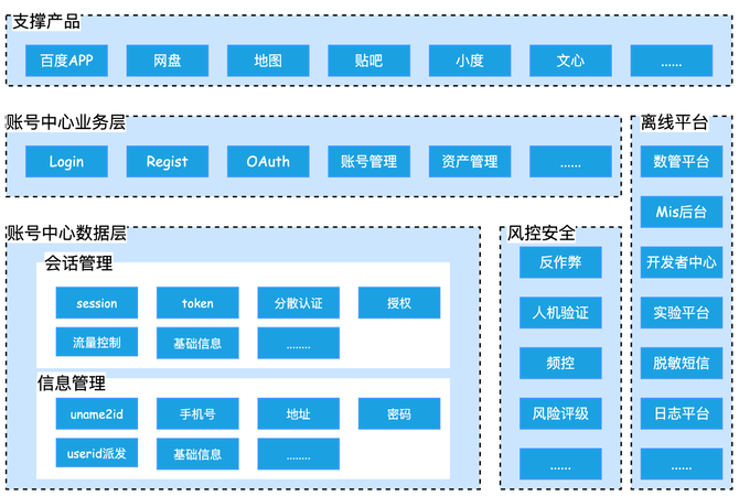 账号系统作为一家企业的核心系统,承载着日益增长的业务需求。以百度为例,简化的结构如下: