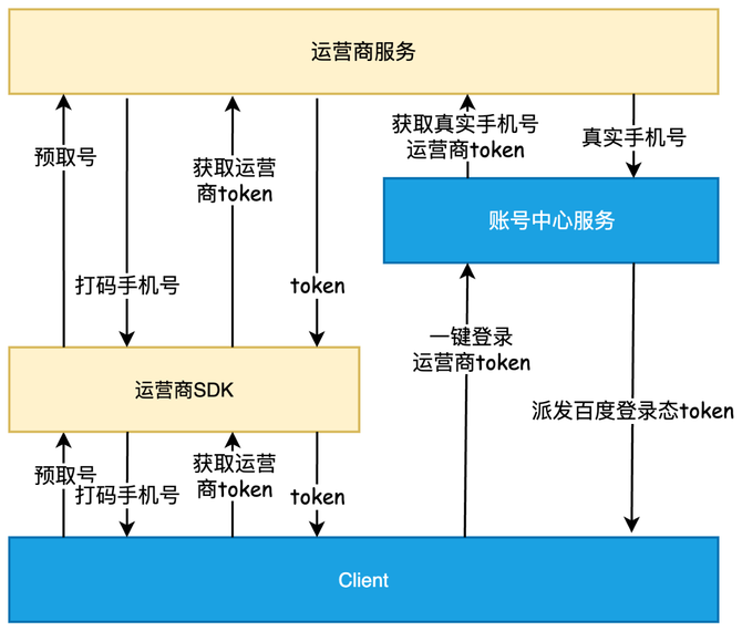 用户可以使用自己手机号码作为登录凭证,实现一键登录,这种登录方式通常与用户的手机号码关联,无需记忆繁琐的用户名和密码,提高了用户体验和登录效率,实现通常依赖于运营商的身份认证系统,通过向运营商发送请求等方式,验证用户sim卡。一旦验证通过,系统即可信任用户的手机号卡号,无需再次输入密码或其他信息。完整的一键登录设计一般为以下流程: