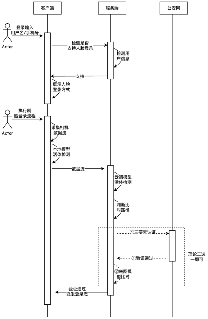 而服务端检测用户账号是否支持人脸登录,一般需要用户主动开启刷脸登录方式,而在开启刷脸登录时,需要用户进行人脸验证录入底图,这样在下次使用人脸验证时,变可以使用录入的底图进行比对。当然,对于安全性要求较高的业务,可以引导用户进行实名,之后的刷脸登录访问公安网进行三要素比对(收费),而百度内部同时支持这两种流程,下面是一次完整流程: