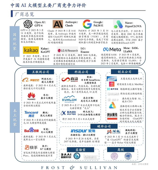 图为:弗若斯特沙利文发布的《AI大模型市场研究报告(2023)》对中国市场提供大模型产品服务的厂商进行了分析和评估。