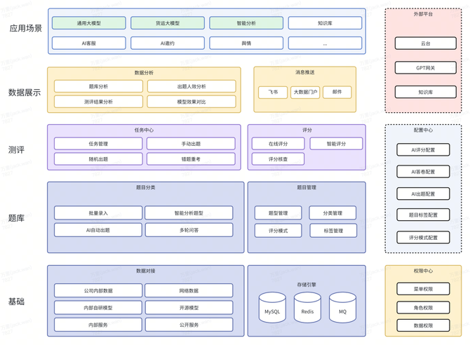 基建层: 评测平台是一个工具化平台,对应的可视化、权限管理以及推送机制依赖于第三方能力,涉及到大模型评测场景,需要额外对接GPT网关,系统对GPT能力进行了一次二次封装