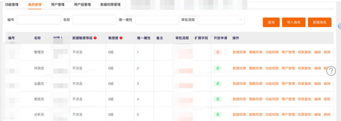 合理的权限划分可以减少上图混乱的功能绑定,在拉拉智评项目中,功能权限和数据权限的组合分别对应评测各个环节的角色所能使用的系统功能范围和测评范围,设计一套便于理解的权限理解体系是很有必要的。