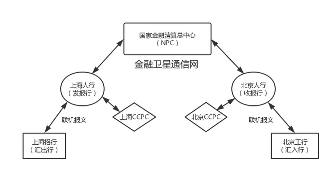 1990 年,中国人民银行清算中心建成,专门为金融机构提供支付清算服务。清算中心包括 NPC(National Process Center,国家金融清算总中心)和 CCPC(City Clearing Processing Center,城市处理中心)。1991 年 4 月 1 日,全国电子联行系统(EIS)开始试运行。EIS 是基于金融卫星通讯网的,它是人民银行专门用于处理异地(包括跨行和行内)资金清算和资金划拨的系统。它连接了商业银行、央行、NPC 和 CCPC。以一位上海招行银行卡的用户要给持有北京工行银行卡的朋友进行汇款,使用 EIS 完成一次支付清算的案例如下图所示: