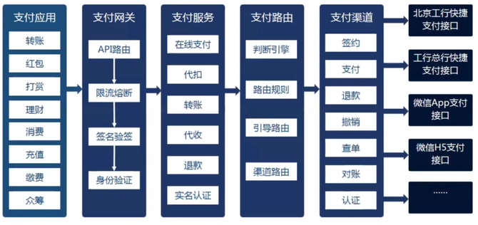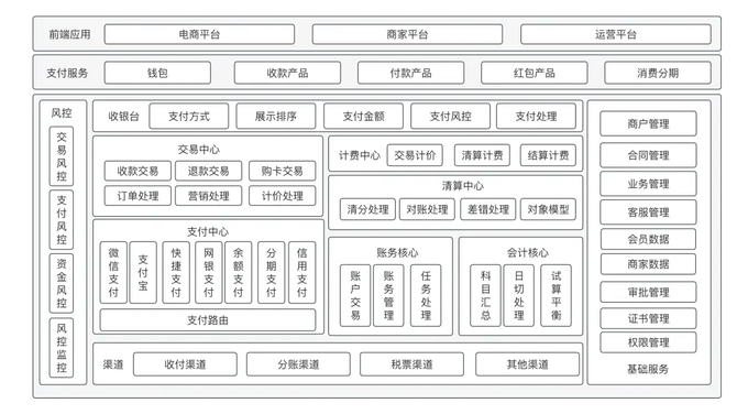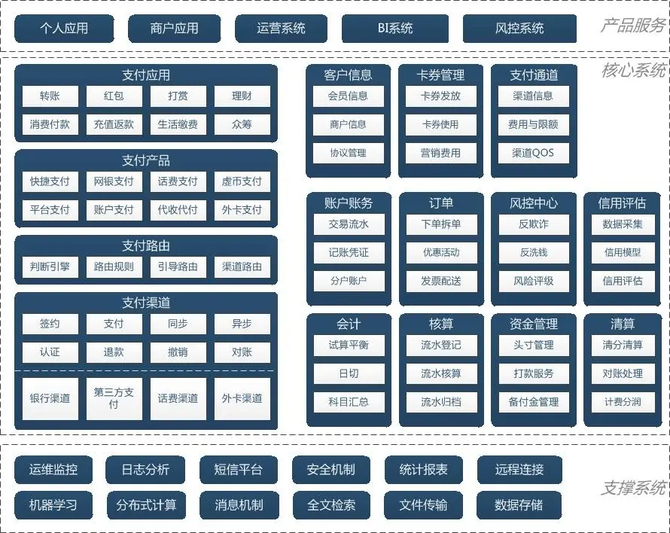 第三方支付系统:即订单同学理解里的“支付渠道”。比如我们作为商户直接对接到微信、支付宝的支付系统中,从而具备支付收款能力。整个系统中的“核心系统”功能往往是大家最为熟悉的部分,它概括了我们平时各种消费支付场景。我们平时进行的电商交易、红包转账等都是“支付应用”的体现形式。