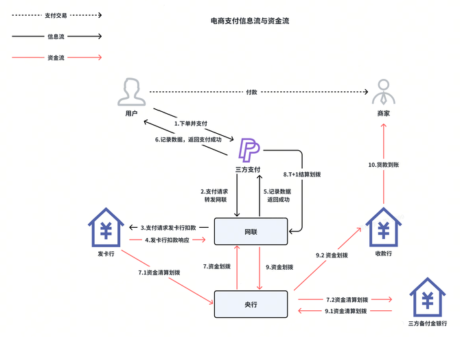 从上图看,步骤 1 到步骤 6 体现了付款方付一笔钱的流程,表示了三方支付一笔收单业务的信息流和资金流,其中步骤 4 中付款方的银行卡余额会被实时扣减,发卡行侧记应付未付。步骤 5 网联记录支付交易相关数据作为跨行清结算业务的依据。步骤 6 三方支付侧更新支付交易结果并逐层通知至订单系统,同时把支付成功消息同步给三方的清结算,清结算依据交易支付的结算要素做清分分录,记录商户应结资金和应收手续费。步骤 7 属于资金流。由网联负责跨行周期清算,网联通过央行清算系统完成资金划拨后资金到了三方备付金账户。步骤 8 属于资金流。三方支付完成周期性结算凭证生成后通过网联发起结算打款,最终资金到账时间依赖于网联清算+资金划拨的时间。自此,一笔电商交易经过用户银行卡扣款、网联清结算、三方支付清结算,最终实现钱货两清。