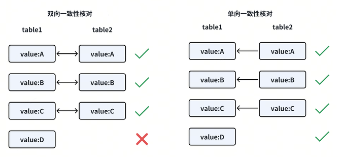 一致性核对包括双向一致性核对和单向一致性核对两种,单向一致性核对无法发现单边数据缺失问题。