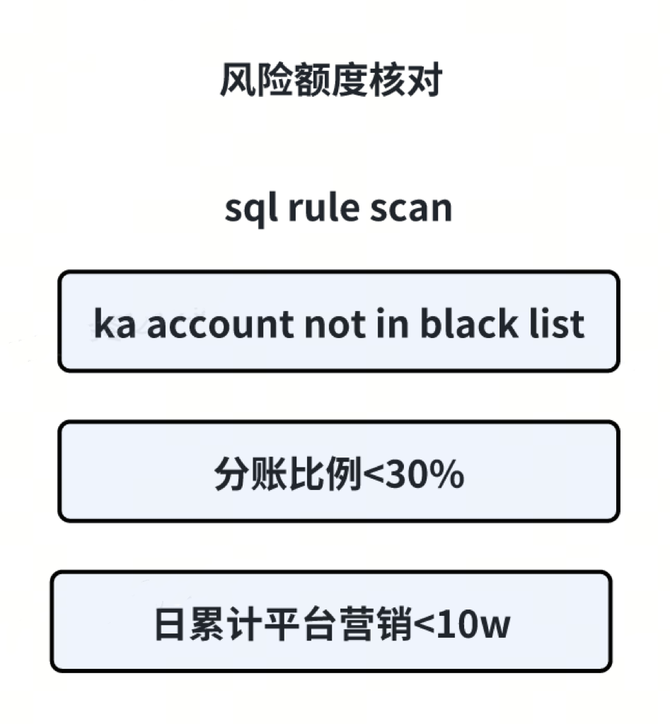 对一些可能有高风险的关键配置与金额相关额度进行校验,如分账比例 <=30%、不能负佣、总营销金额不能超过每日上限等。