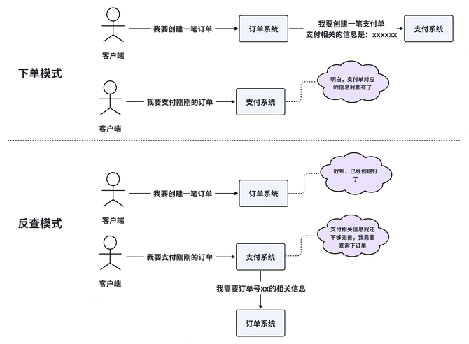 由于监管 KYC 的要求,一笔支付单不仅需要支付相关信息的如支付方式、支付金额、支付有效时间等,也需要订单的买家信息、卖家信息、商品信息等等。这些信息客户端无法全部给到,且基于安全的角度,也不能由客户端通过公网传参的方式传递,需要订单域与支付域进行交互传递相关信息。目前得物支付提供了下单模式(业务方调用支付系统创建支付单)和反查模式(业务方实现 PayInfo SPI,支付系统反查业务方获取支付信息)两种模式,目前订单是按照反查模式与支付交互。