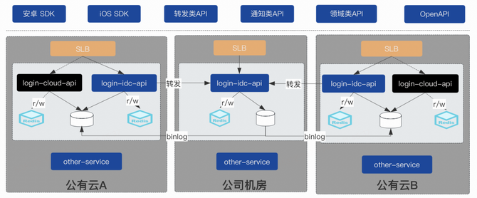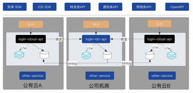 由于存在以上两个显著的挑战,项目进展等因素的考虑,最终演变的应用架构如下,也因此账号登录系统,在公司机房和公有云机房演变出了两套代码仓库(login-idc-api / login-cloud-api)。
