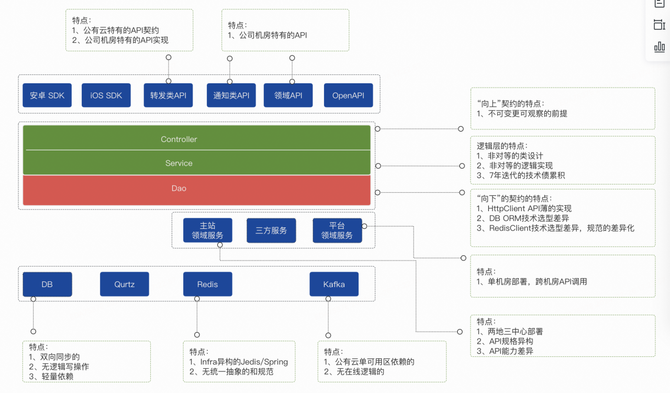领域类和通知类API链路:这条链路虽然不是核心,但这是混合云数据架构差异的体现。生产环境的调用集中在公司机房,能力”较小“的公有云应用,向公司应用融合靠拢,也正因如此,统一之后的代码仓库是以公司机房代码仓为基准。
