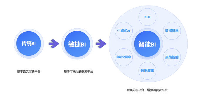 商业智能(BI)技术的演进从传统BI到敏捷BI,再迈入当前的智能化BI时期,历经多重转变。Quick BI作为中国领先的BI产品,已连续四年跻身Gartner魔力象限,显著地代表了这一趋势。敏捷BI时代要求用户通过直观的交互如点击和拖拽进行操作,而智能BI旨在进一步简化操作,通过引入类似智能助手的工具,以降低操作难度,提升用户体验。