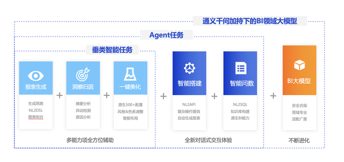最里层是垂直任务层,相当于树叶的枝条,是应用层面的原子Agent任务。这些原子任务已经涵盖了之前QBI已经具备的能力,如传统的机器学习能力、洞察归因、异常检测、智能搜索,以及为适配大模型而新接入的一些任务,如生成图表、生成报表、配置修改和样式美化。