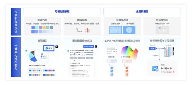 “一键美化”功能致力于将报表的视觉呈现提升至全新水准,为用户带来既简易又高效的视觉设计体验。通过对仪表板进行巧妙的层次设计,分为负责色彩搭配的图表层和处理背景及装饰元素的氛围层,使得每份报表都能在视觉上脱颖而出。