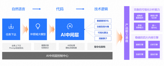 系统架构设计的核心在于将用户的自然语言指令转化为机器可执行的代码和技术逻辑,最终显现为直观的前端产品体验。随着大模型的突破性增长,自然语言的指令能够无缝转化为代码,进而与底层技术逻辑相连通。这整个流程的关键在于AI中间层的加入,它引入了一套标准化的结构化语言—领域特定语言(DSL)。这项创新确保了在BI领域中模型应用编程的精确性和效率。
