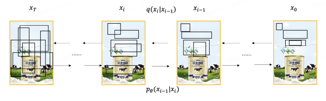 扩散模型是一类使用马尔可夫链将噪声转换为数据样本的概率生成模型。如上图所示,我们将海报布局生成问题作为一个噪声到布局的生成过程,通过学习去噪模型以逐步调整噪声布局。因此扩散模型生成的海报布局也同样包括两个过程:扩散过程和去噪过程。给定一个海报布局,我们逐渐添加高斯噪声以破坏确定性的布局结果,我们称这个操作为扩散过程。相反给定初始随机布局,我们通过逐步去噪的方式获得最终海报布局称为去噪过程。