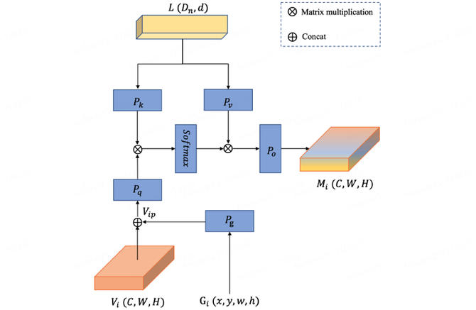 相较于直接将视觉特征和文本特征简单拼接,我们设计了一个能够识别视觉-文本关联的模块(VTRAM)来对齐图像与文本的特征域。这个模块能够意识到视觉元素和文本元素之间的关系,并能从图像和文本中优化特征的利用,这样使得对内容的理解更加全面。上图展示了VTRAM的流程,它通过两步实现了第i个RoI特征??和语言特征?的多模态融合。首先,为了在视觉特征中添加明确的位置信息,将RoI特征??及其对应的位置嵌入进行拼接,以获取视觉位置特征。之后,我们将加入位置信息的视觉特征作为query,语言特征作为key和value,进行cross attention计算来得到最终的多模态特征Mi。